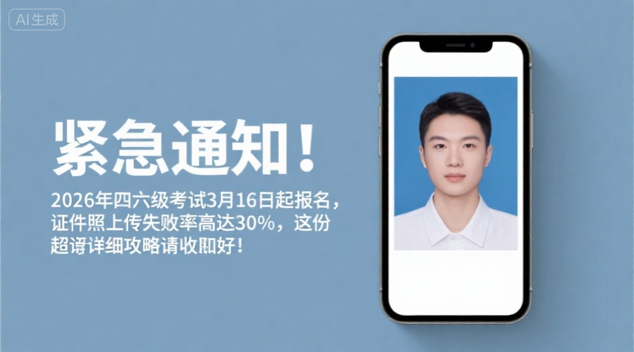 各位同学请注意!2026年上半年全国大学英语四、六级考试(CET)的报名大幕即将拉开。作为大学期间最重要的外语能力证明,四六级考试关系到毕业、升学、求职等方方面面,报名环节至关重要。每年都有不少同学因为报名照片不合格、信息填写错误、错过缴费时间等问题而遗憾错过考试。为了帮助大家顺利报名,一次成功,我们整理了这份超详细的2026年四六级考试报名全攻略,特别是针对最让人头疼的“报名照片”问题,提供了完美的手机端解决方案,让你从容应对!